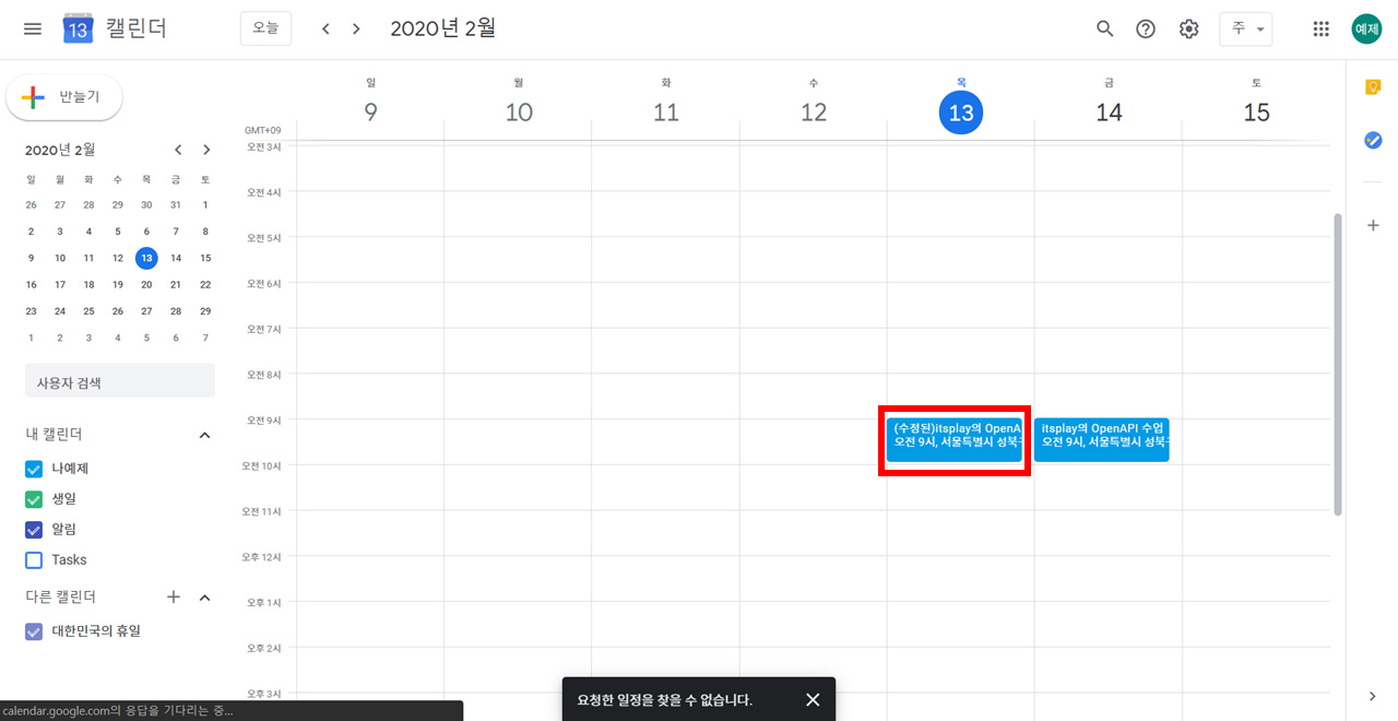 | 데이터 형식 | 요청한 캘린더의 제목({"summary" : "캘린더 제목"}), 요청한 캘린더의 상세 설명({"description" : "캘린더 설명"}), 요청한 캘린더에 등록된 일정들({"items": ...}) 등 |