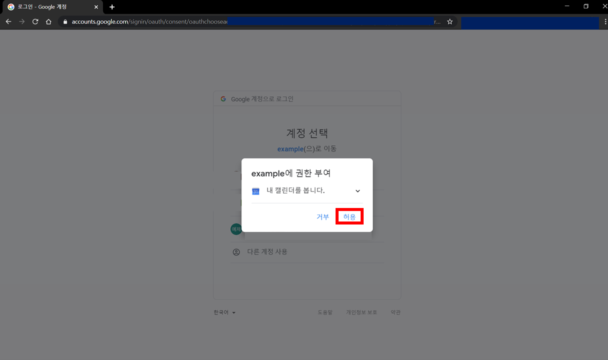 # 새 창이 열리면서 구글 로그인 및 정보 제공 동의 후 최종 인증이 완료됩니다.