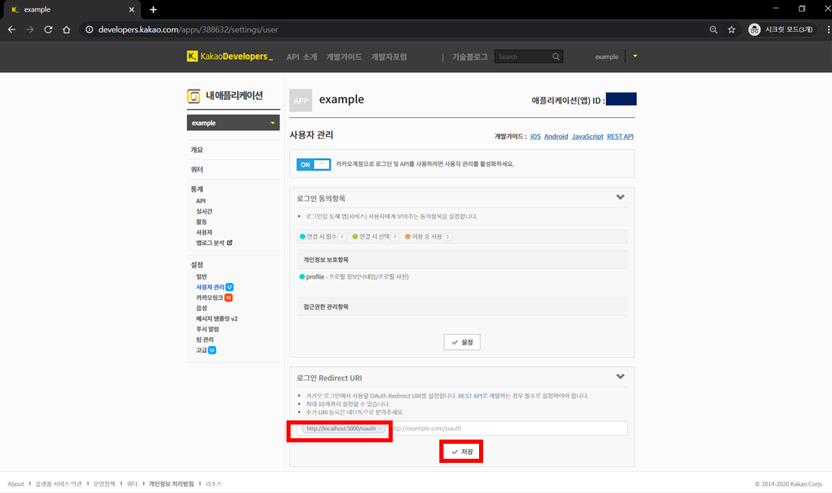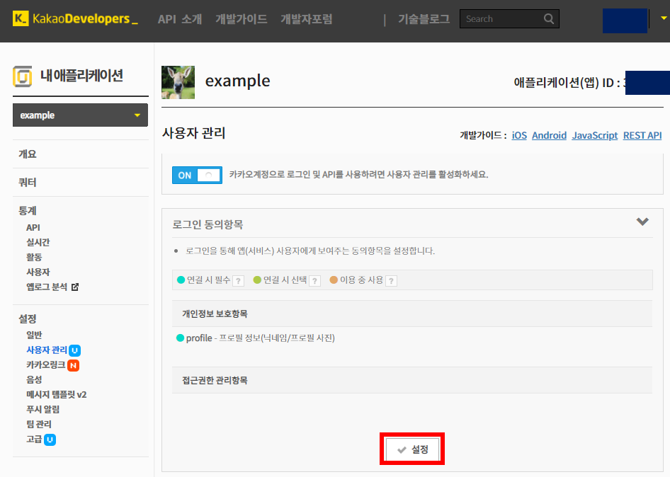 Step 6-1) [내 애프리케이션] > [앱] (앱 이름을 example로 생성한 상태) > [사용자 관리] > [설정] 클릭
