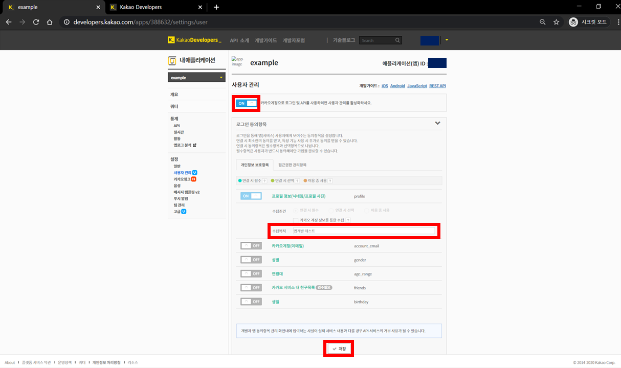 Step 6-2) [접근권한 관리항목] 탭 > [카카오톡 메시지 전송] 을 "ON"으로 설정 > 수집 조건 : 연결 시 선택 로 설정 > [수집목적] 입력 > [저장] 버튼 클릭