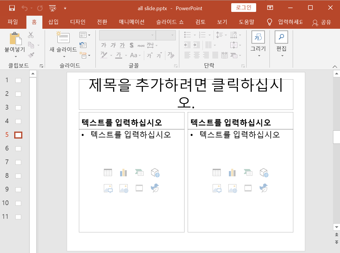 총 11개의 슬라이드가 추가되었고, 5번째 슬라이드를 클릭해보니 "비교" 레이아웃이 적용되어 있습니다.