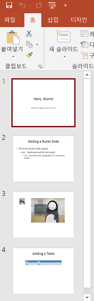 저장된 test.pptx를 열어보세요. 와우!! 감탄사가 절로 나오죠?ㅎㅎ