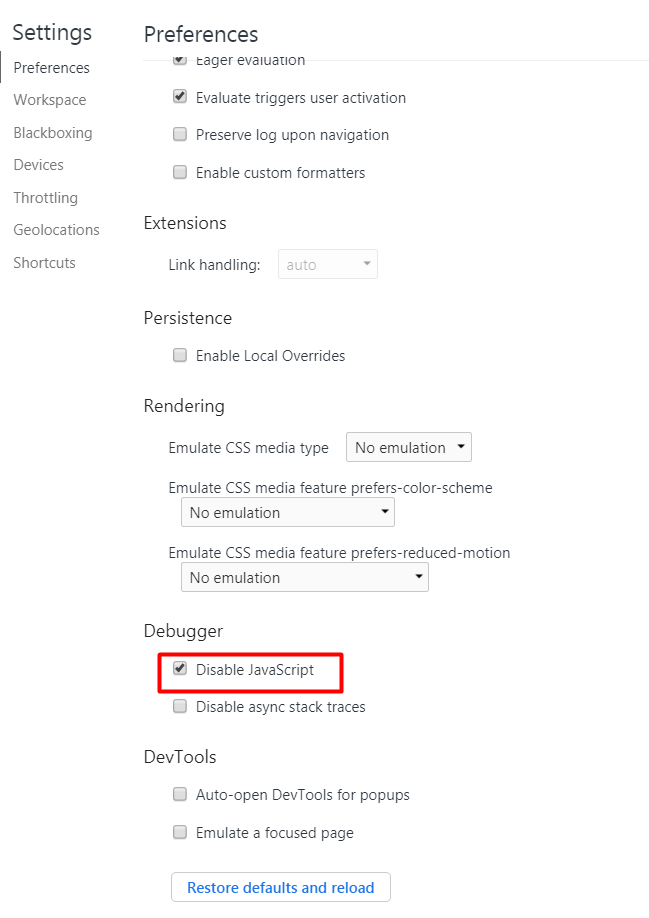 settings 아랫부분으로 내려가면 "Disable JavaScript" 체크박스에 체크를 합니다.