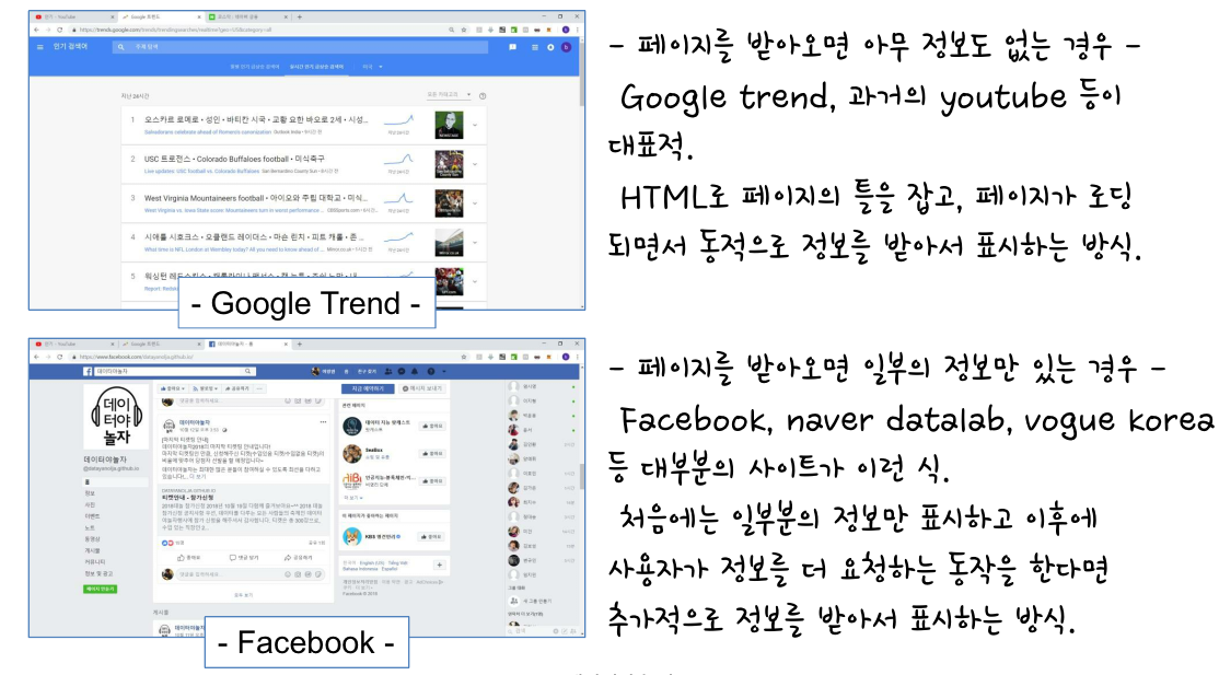 이런 페이지 동작 방식 때문에 "동적 페이지"의 경우는 파이썬에서 requests 라이브러리를 이용해서 html 응답을 받아와도 동적인 데이터는 보이지 않는 것입니다. 받아온 응답에는 정적 페이지의 html 코드만 포함되어있으니까요.