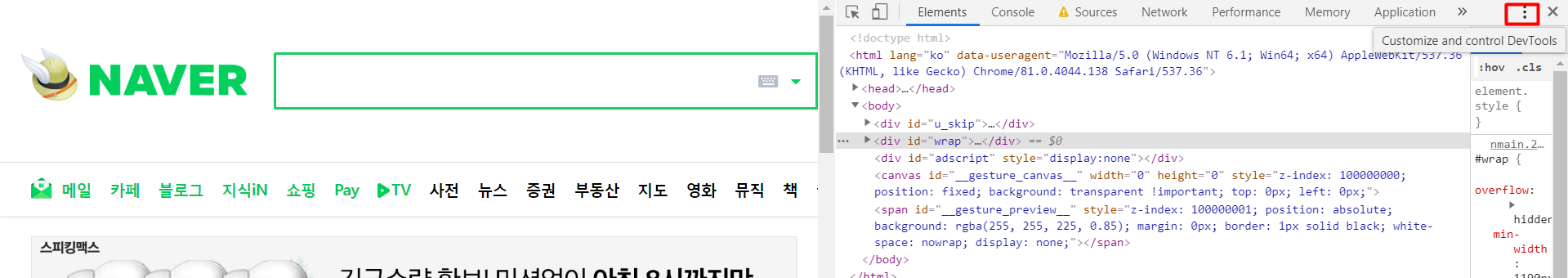 점3개가 있는 부분에 마우스를 올려두면 "Customize and Control DevTools"가 있습니다. 클릭하시면,