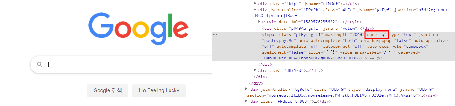 구글 검색창의 tag name을 확인합니다. query를 의미하는 'q'라는 이름으로 되어 있네요.