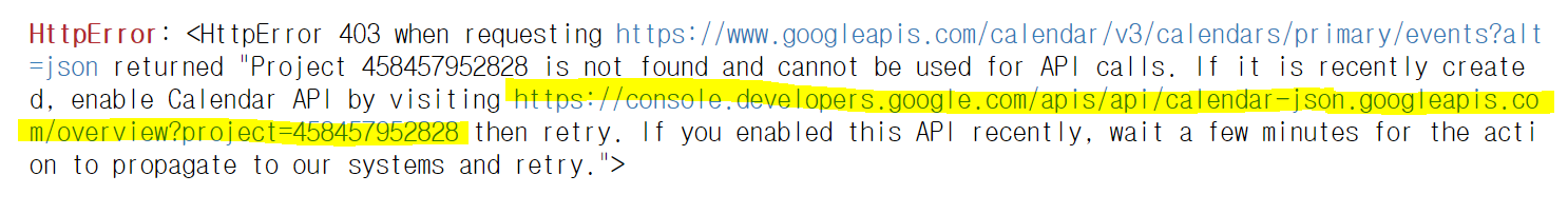 에러에 주어진 링크를 클릭하여, api 활성화를 시켜준다.