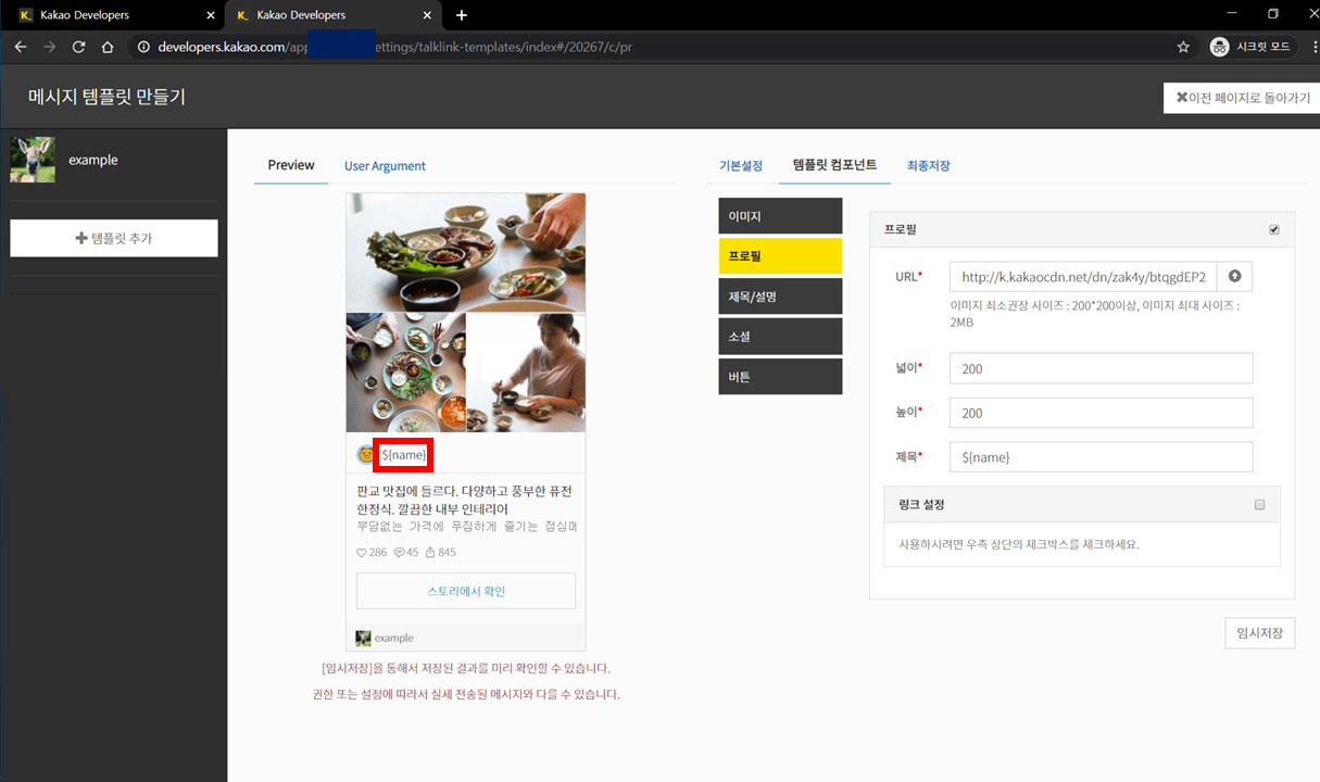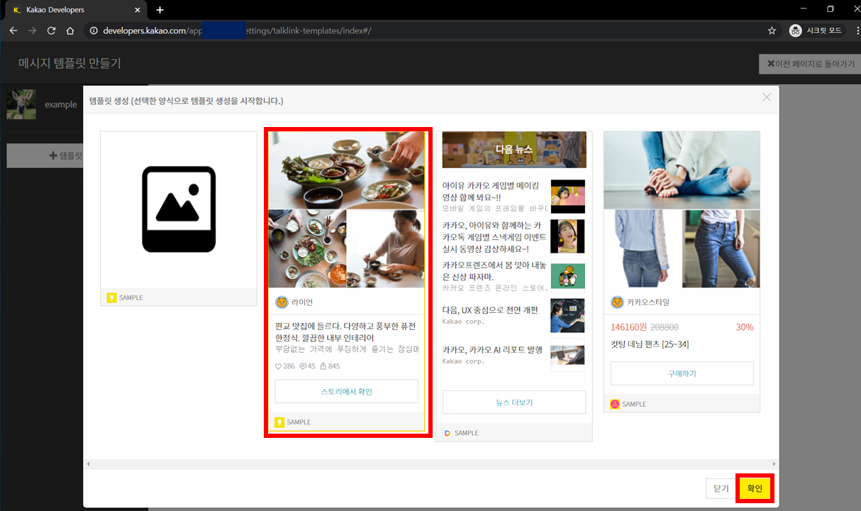 커스텀 템플릿을 사용하기 위해서는 [메시지 템플릿 v2]에서 사전에 사용할 메시지 템플릿을 정해주어야 합니다.