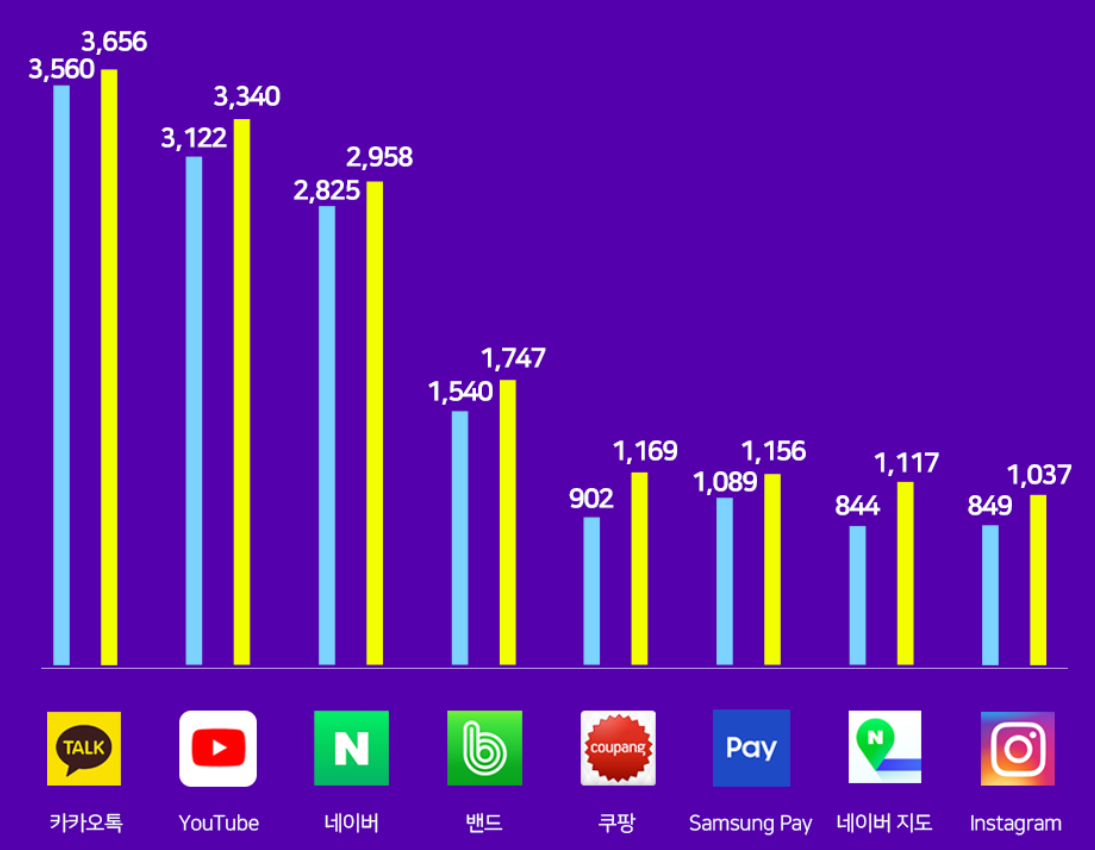그럼 5시간 중 어떤 앱을 가장 많이 사용할까요? 2018년도에 한국인이 가장 많이 사용하는 앱을 조사했더니 1위가 카카오톡이었습니다.