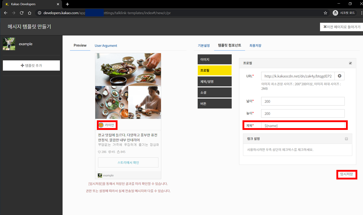 [라이언] 클릭 > 우측으로 이동되며 [제목]을 ${name}으로 입력하고 [임시저장] 클릭