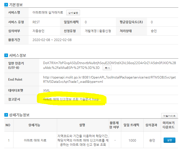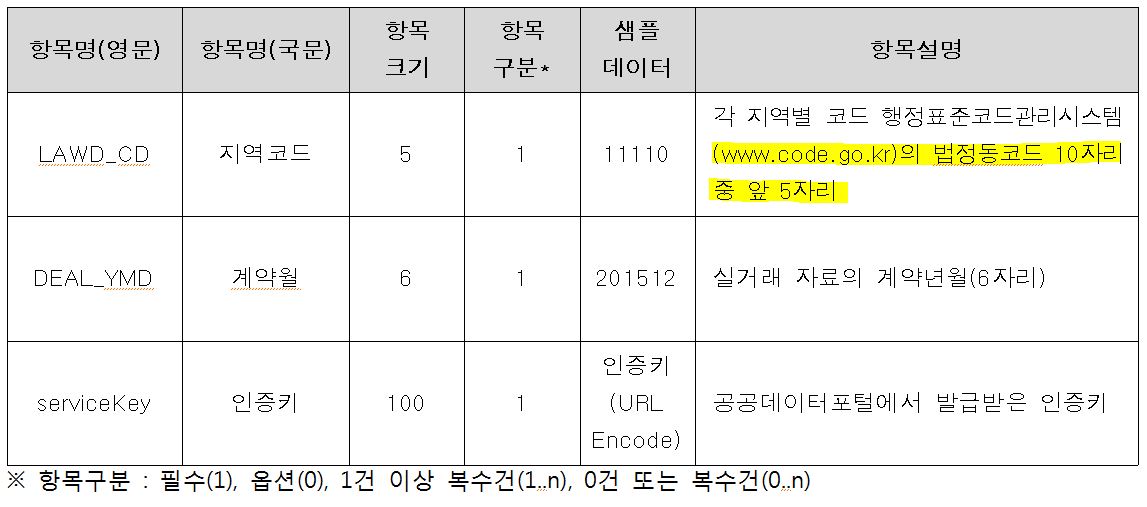 - "아파트매매 신고정보 조회 기술문서.hwp" 파일 다운로드 > 파라메터 확인