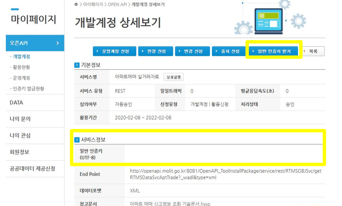 신청 순서 : www.data.go.kr > [부동산거래정보] 클릭 > [공공데이터보기] 클릭 > [오픈API] 클릭 > [국토교통부 실거래가 정보] 클릭 > [아파트매매 실거래자료 - 활용신청] 클릭 > [신청] 클릭