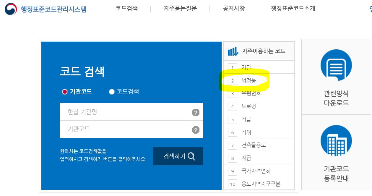 www.code.go.kr > [법정동] 선택 > [법정동 코드 전체자료] 클릭 > 법정동코드 다운로드 > 파일 포맷을 utf-8 로 변경