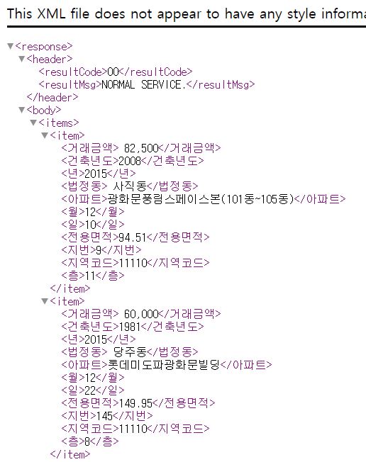 이것으로 실거래가 데이터를 가지고 오는것은 완성! 하였습니다.
