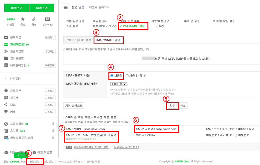 | 순서 : [환경설정] 버튼 클릭 > [POP3/IMAP 설정] 버튼 클릭 > [IMAP/SMTP설정] 탭 클릭 > [사용함] 선택 > [확인] 버튼 클릭 |