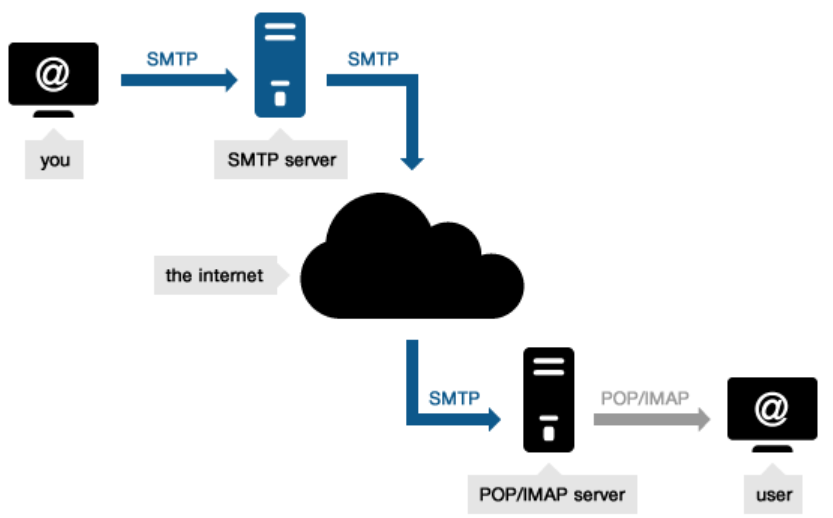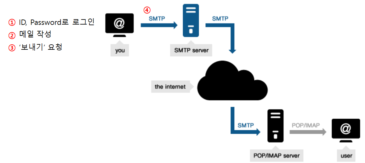 이메일을 보내면 SMTP 서버(우체국 역할)에 저장하고, 받을 사람의 POP3서버나 IMAP서버(우체국 역할)로 보내지게 됩니다. 이 흐름과 규약에 맞춰 메일을 주고 받을 수 있게 됩니다.