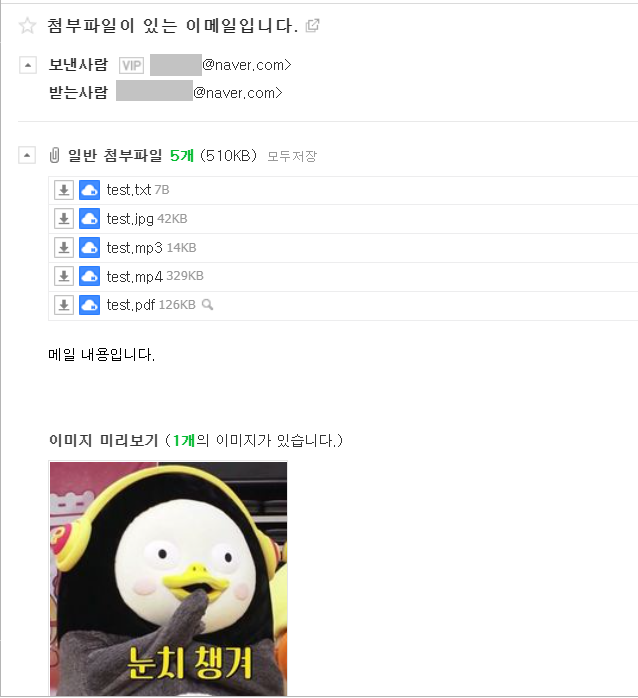 텍스트만 구성된 메일과 파일이 첨부된 메일입니다.