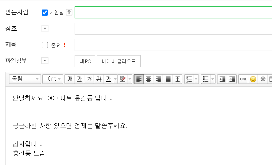 필자의 경우는 서명이나 서식을 작성해 두어 업무 효율을 높였습니다. 이 정도의 메일 서식을 넣어두어도 반복적인 업무를 줄일 수 있었습니다.