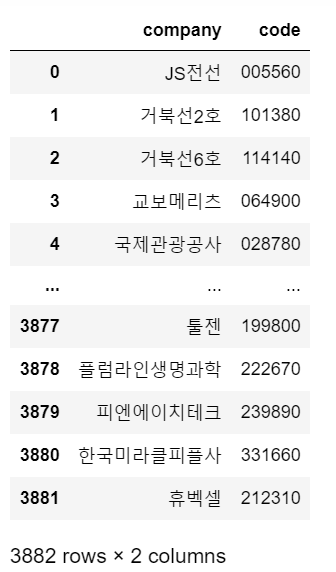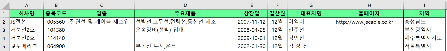 원하는 종목코드 값 뿐만이 아니라, 업종, 대표자명, 지역까지 정보가 들어가 있네요. 여기서 '회사명'과 '종목코드'를 사용할 것입니다.