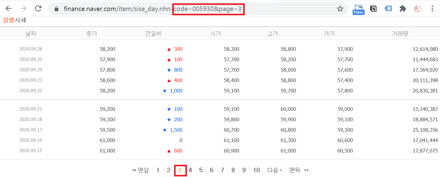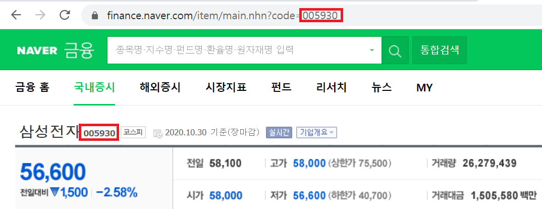 삼성전자 글자 옆에 '005930'이라는 6자리 숫자값과, url에서 보면 code= 옆에 6자리 숫자가 동일합니다.