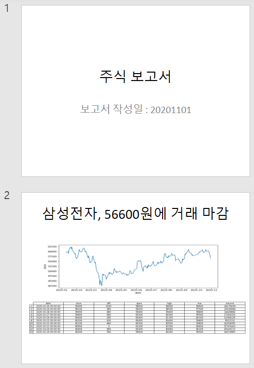 한단계 한단계가 버릴 정보가 없습니다. 주식에 대해서 잘 아시는 분들이라면, 일별 시세 값을 이용해서 다양한 차트를 그리실 수 있을 것이고, 필요한 정보들을 추가 구성한 파워포인트를 만들 수 있습니다. 즉, 나만의 주식 보고서를 만들 수 있는 것이지요.