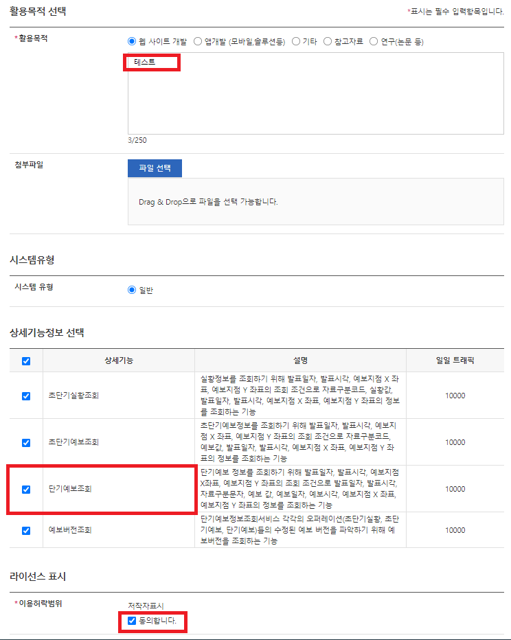 활용목적을 반드시 작성하시고, [단기예보조회]가 선택되어 있는지 확인하고, 라이선스를 확인하여 [동의합니다]를 체크하고 [신청] 버튼을 눌러줍니다.