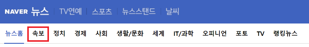 먼저 네이버 뉴스 (news.naver.com/)에 접속하고, 제일 빠르게 전달되는 뉴스만 보기 위해 "속보"를 클릭합니다.