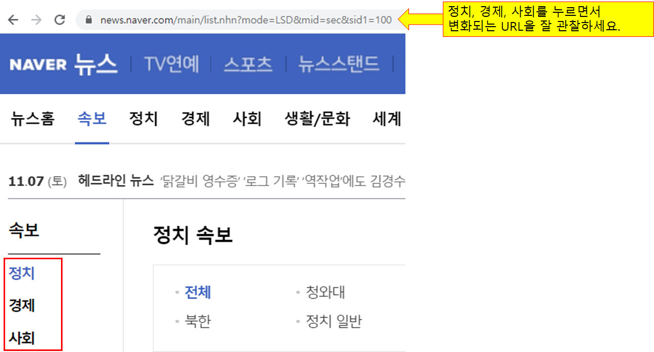정치, 경제, 사회별로 접속주소(url)의 변화를 확인해 봅시다.
