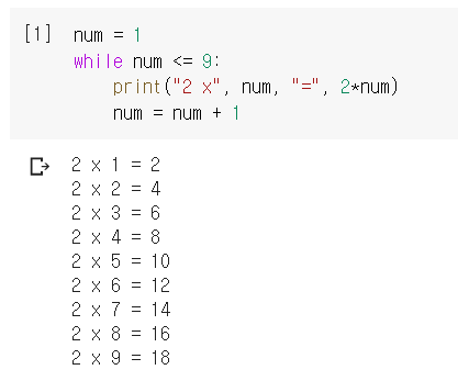 => num이 9이하인 동안 실행문장을 반복해라. 그런데, num의 시작값이 1부터 이므로, num=1을 제일 상단에 넣어주고,