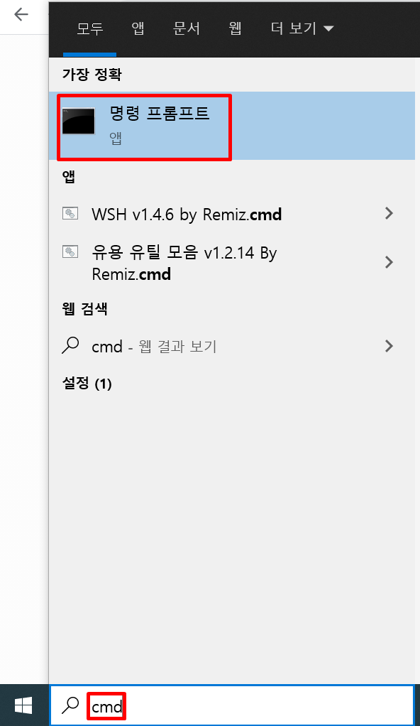 window key옆에 찾기에서 cmd를 입력하면, "명령 프롬프트"를 클릭합니다.