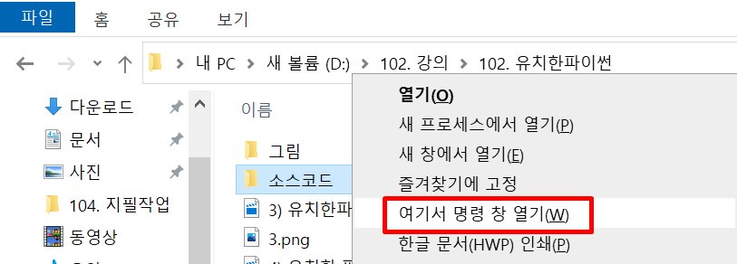 windows 10인 분들은 "여기서 명령창 열기"가 없어서 레지스트리 등록이 필요합니다.