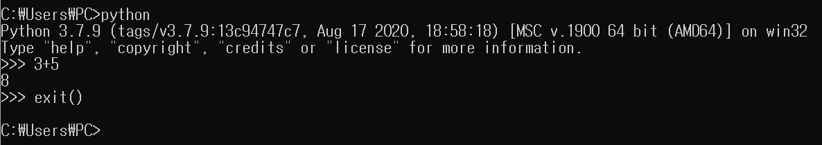 명령 프롬프트로 python을 실행해서 python버전을 확인하고, 간단한 덧셈을 수행해 보겠습니다.