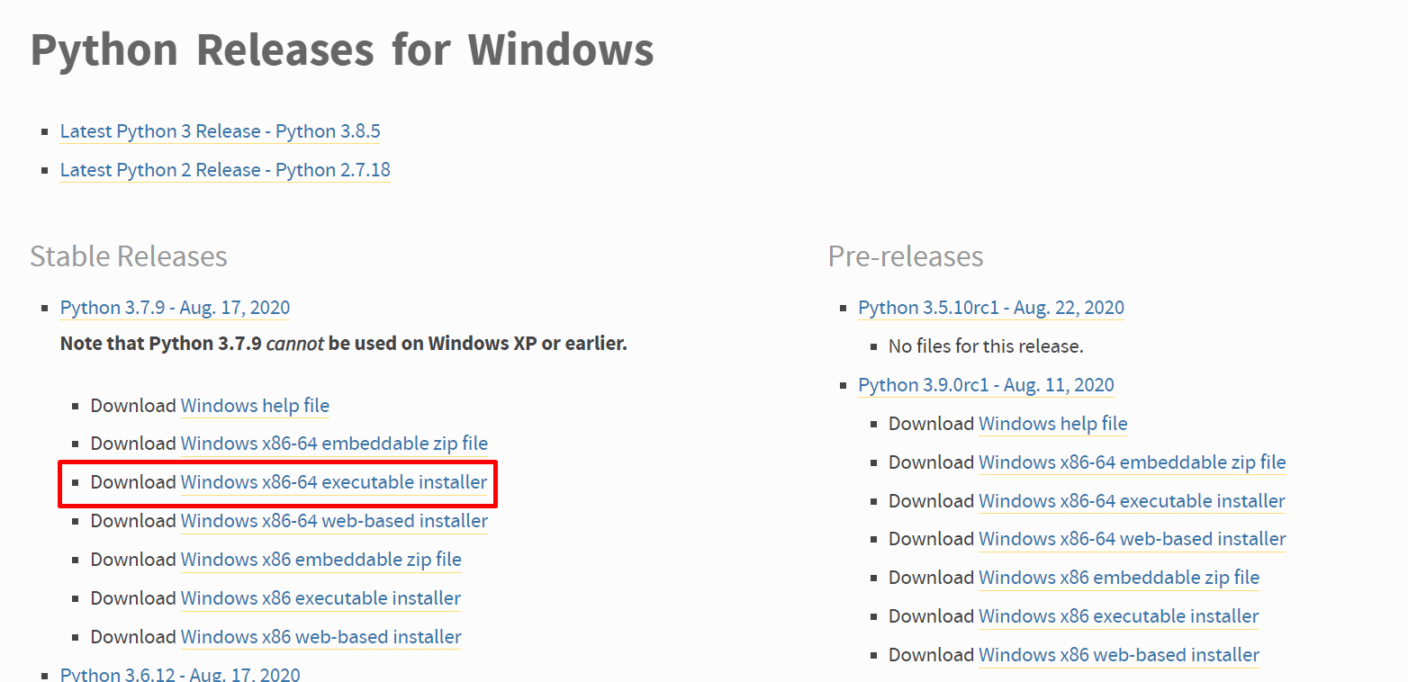 ※ 시간이 지나서 stable 버전이 변경되어 다른 버전이 보일 수 있습니다(현재는 3.7.9 버전). 놀라지 마시고, 그냥 Stable Releases 항목에 Window x86-64 executable installer 또는 Window x86 executable installer를 설치하시면 됩니다.