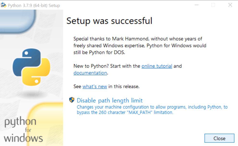 python이라는 글자를 입력해서 설치한 버전 정보를 확인합니다.