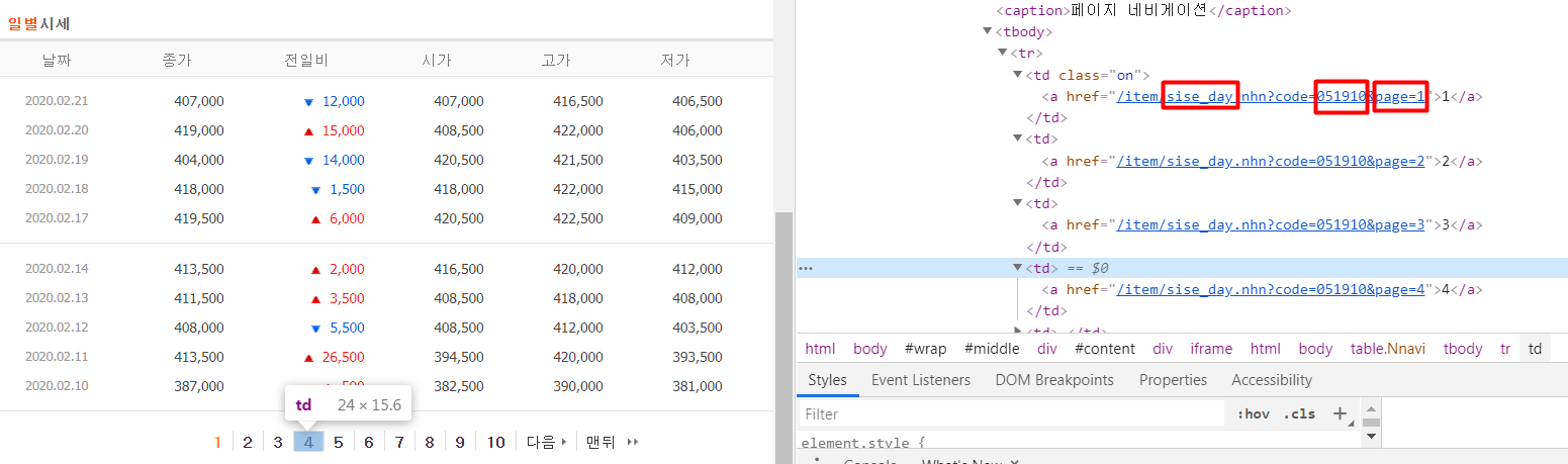 - 일별 시세 구조 : https://finance.naver.com/item/sise_day.nhn?code=[종목코드]&page=[페이지번호]