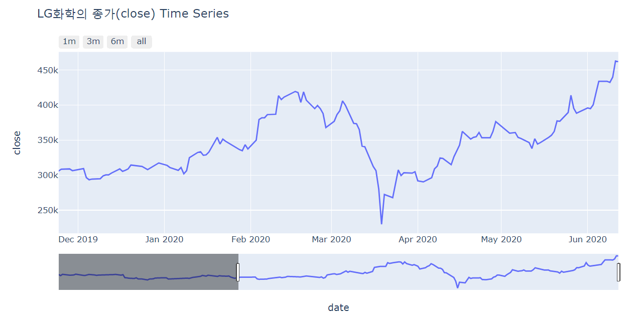 Plotly라이브러리 (https://plotly.com/python/)를 이용해 Time Series 그래프 그리기를 그려봅시다.