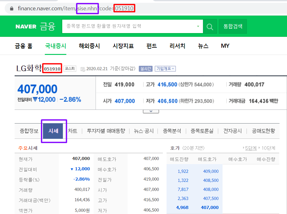 https://finance.naver.com/ > "LG화학" 검색 > [시세] 탭 클릭