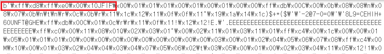 이미지(jpeg)를 binary 형태로 보면 이런 정보 값들이 들어가 있습니다. 즉, jpeg binary 데이터를 파일로 저장하면 이미지가 보이게 됩니다.