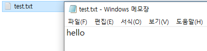 작업 중인 폴더에 test.txt 파일이 생겼고, 그 파일을 열어보니 hello 가 적혀 있습니다.