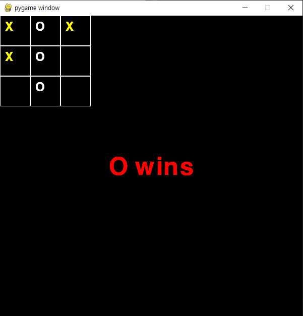 먼저 게임 종료는 앞서 추가한 game_over 값이 X_WIN 인지 O_WIN 인지 판별하게 되고 해당 상태를 기반으로