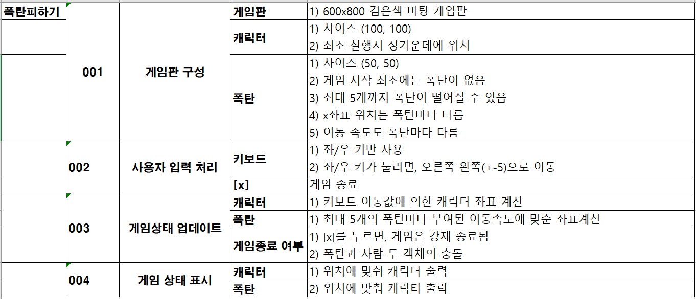 이번에 만들 게임은 폭탄 피하기 게임입니다. 폭탄 피하기 게임의 규칙은 다음과 같습니다.