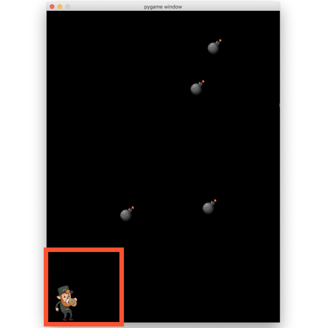 7번 라인은 Rect() 함수를 통해서 폭탄 이미지의 사각형 크기를 가져와 네모난 사격형 안에 폭탄 이미지를 넣어주는 코드입니다.
