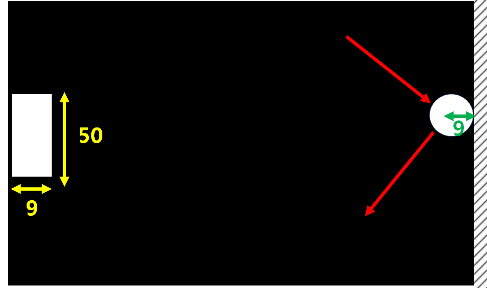 > 공의 반지름은 9, 시작위치는 100x100, 이동은 5만큼씩