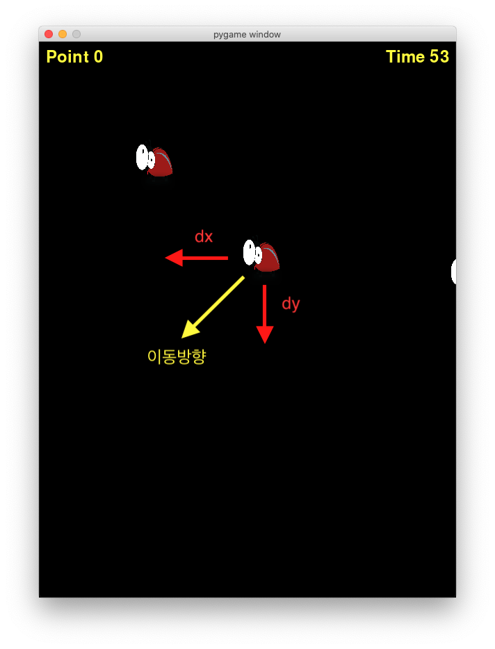 Step 2) 벌레 출력하기 -> 이동속도 dx, dy를 설정하여 벌레 이동값을 통한 출력