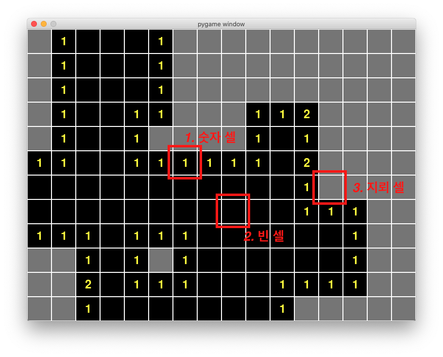 따라서 지뢰가 없는 모든 셀을 활성화 시켜 모든 지뢰를 찾으면 되는 게임입니다.