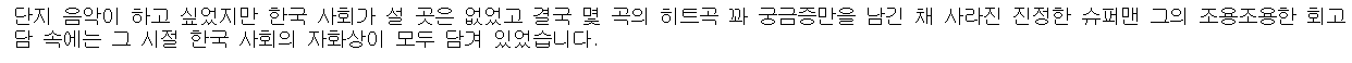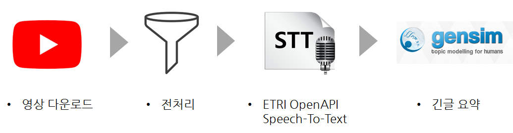 - 이를 이용해서 회의록 요약 프로젝트를 진행할 수 있습니다. 사용하는 데이터만 youtube 영상 -> 회의녹취 파일로 변경되었을 뿐 처리하는 부분들을 똑같겠죠? 다만, ETRI API 경우 구두점을 제공하지 않고, 일반적인 대화의 경우는 뉴스와는 달리 마지막 문장 표현이 명확하지 않습니다. ~했자나요. ~그랬습니다. ~결론내시죠. 등 말이죠.