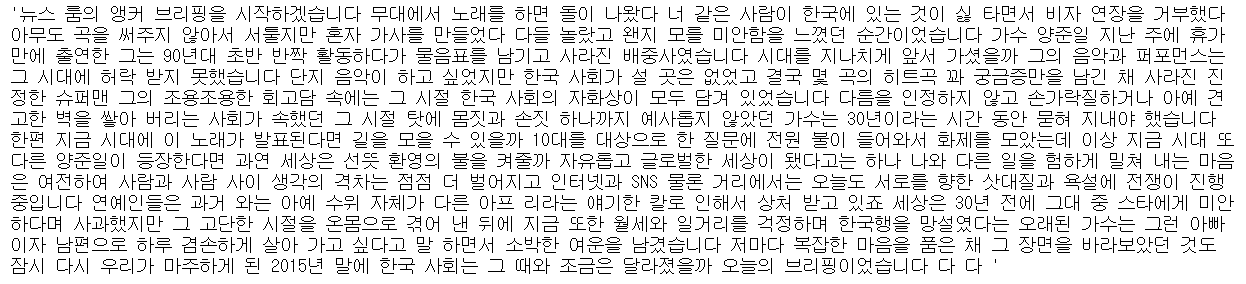 여기서 문제가 생겼습니다. Text요약을 할 경우, 문장의 기준이 중요한데요, STT의 결과를 보면 문장 분리가 되어 있지 않습니다. 즉, 구두점이 없어서 기계 입장에서는 문장임을 인식할 수 없는 것이죠.