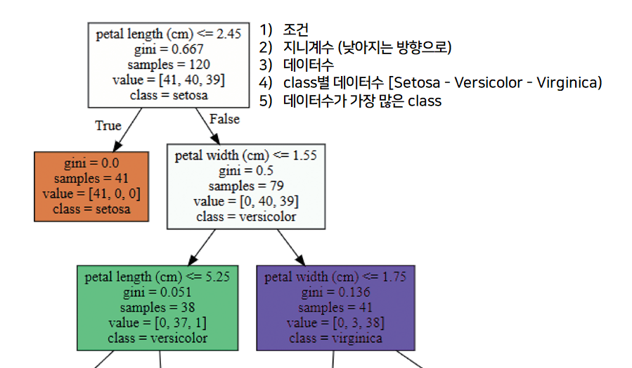 - 사이킷런에서 사용하는 DecisionTreeClassifier는 기본으로 지니계수를 이용하여 분할. 즉, 지니계수가 낮은 조건을 찾아서 자식 트리 노드를 반복적으로 분할한뒤, 데이터가 모두 특정 분류에 속하게 되면 분할을 멈추고 분류를 걸정함