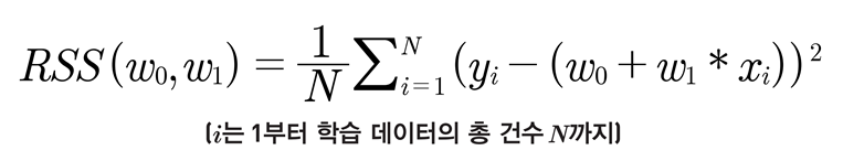 RSS를 최소로하는 w0, w1, 즉 회귀계수를 학습을 통해서 찾는 것이 머신러닝 기반 회귀의 핵심사항이다.