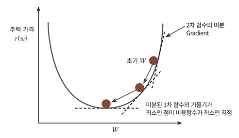 오류값과 관련된 RSS를 비용함수(cost function, loss)이라고 하며, 비용함수가 최소화할 수 있는 회귀계수(w)를 찾는다(=최적화합니다). 즉, '점진적으로' 반복적인 계산을 통해 W파라메터 값을 업데이트 하면서 오류값이 최소가 되는 W파라메터를 구하는 것이다.